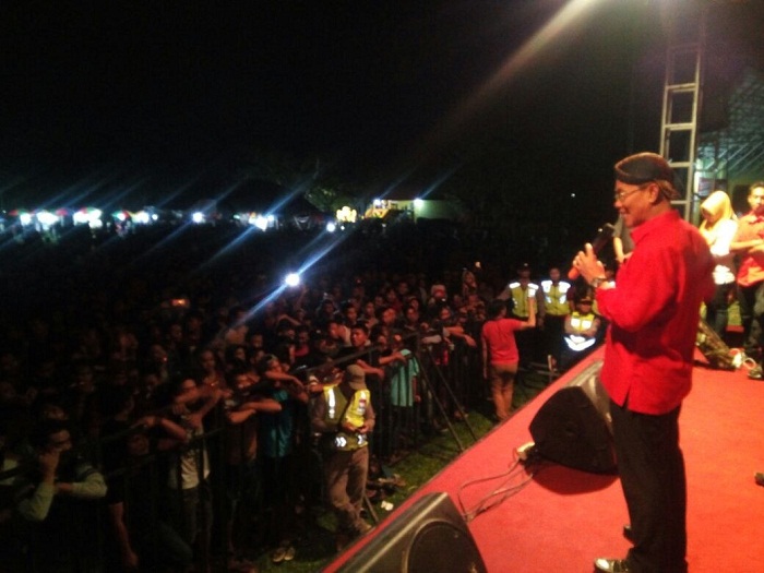 “Saya yakin semua yang hadir disini cinta budaya jawa, cinta tanah air dan cinta campursari. Betul apa ora,” kata Rusmadi yang disambut gemuruh teriakan yel-yel dari warga.