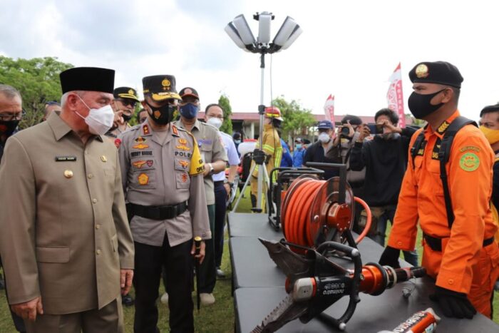 BERITAKALTIM.CO- Pemerintah Provinsi bersama TNI, Polri, BNPB dan Basarnas dan segenap jajaran dan sejumlah relawan menggelar Apel Kesiapsiagaan Bencana Alam Kaltim di lapangan SPN Balikpapan, Jumat (20/11/2020).