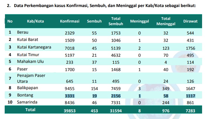 Satgas penanganan Covid-19 Kaltim mengumumkan dalam rilisnya, masih terjadi pelonjakan jumlah orang terinfeksi virus korona setiap harinya. Pada Jumat 29 Januari sampai pukul 15.00 WITA, penambahan kasus aktif sebanyak 667 kasus. Penambahan kasus aktif harian terbesar ada di Kutai Kartanegara 166 kasus, disusul 98 kasus di Bontang dan 95 kasus di Balikpapan.