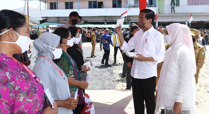 BERITAKALTIM.CO- Presiden Joko Widodo didampingi Ibu Iriana Joko Widodo menyerahkan Bantuan Modal Kerja (BMK) dan Bantuan Langsung Tunai (BLT) minyak goreng kepada peserta Program Keluarga Harapan (PKH) di Pasar Sungai Duri, Kabupaten Bengkayang, Provinsi Kalimantan Barat, pada Selasa, 9 Agustus 2022.