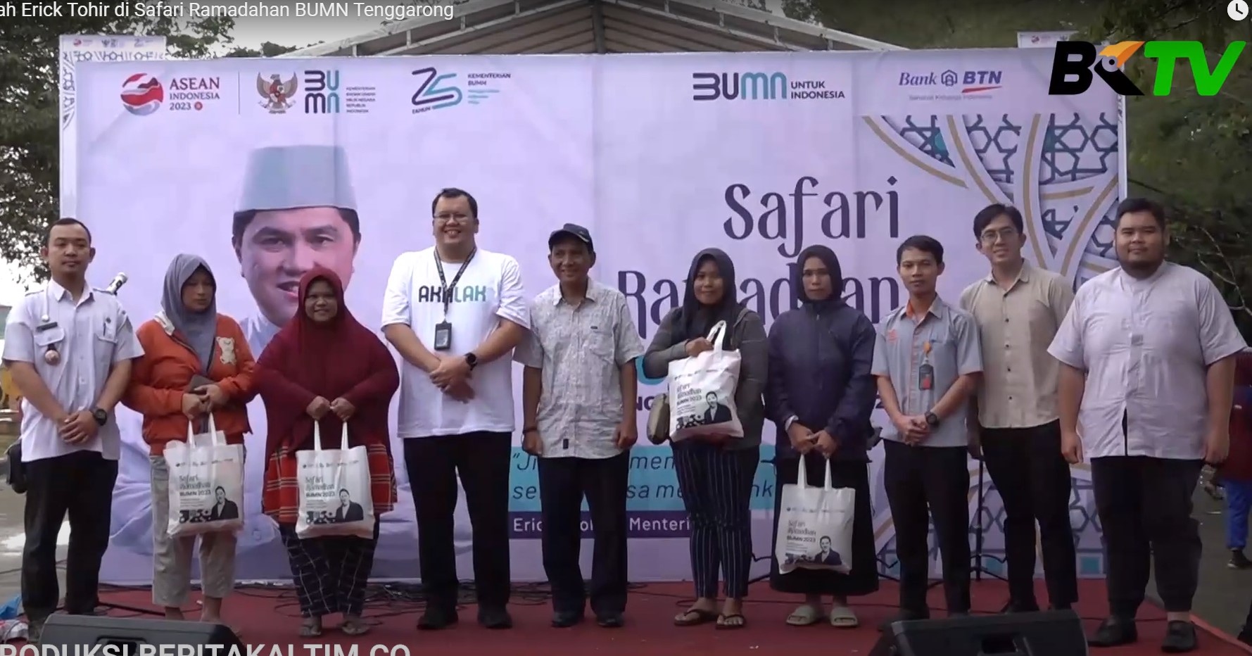 Foto wajah Menteri BUMN Erick Tohir muncul menghiasi spanduk dan tas goodiebag bertuliskan Safari Ramadhan BUMN 2023. Satu persatu warga dilayani, setelah sebelumnya mendapat potongan voucher pembelian.