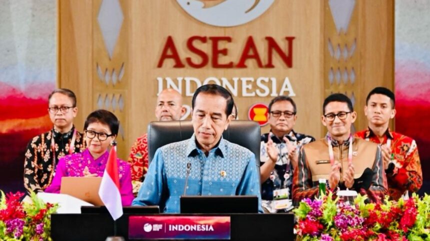 BERITAKALTIM.CO- Presiden Joko Widodo membuka Konferensi Tingkat Tinggi (KTT) ke-15 Segitiga Pertumbuhan Indonesia-Malaysia-Thailand atau IMT-GT yang digelar di Komodo Ballroom, Meruorah Convention Center, Labuan Bajo, Kabupaten Manggarai Barat, Provinsi Nusa Tenggara Timur, Rabu, 10 Mei 2023. Dalam pertemuan subregional tersebut, Presiden Jokowi mengajak semua pihak yang terlibat untuk mengobarkan semangat kolaborasi.