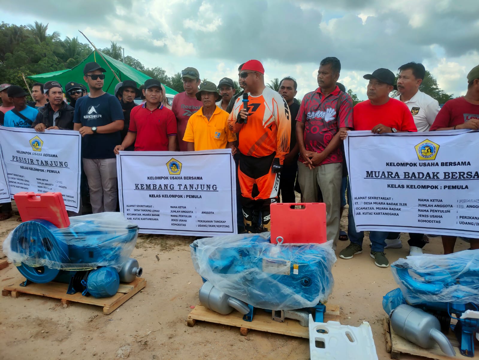Di depan nelayan yang ada di Muara Badak, Edi Damansyah menyerahkan bantuan mesin Dongfeng ke beberapa kelompok nelayan yang ada, serta memberikan bibit bandeng dan pakannya.