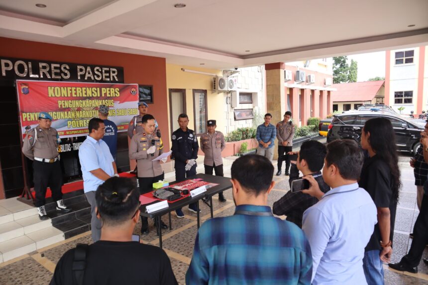 BERITAKALTIM.CO– Waka Polres Paser Kompol Donny Dwija Romansa ST, SIK, MH, bersama Kasat Resnarkoba AKP Suradi, S.H, Kasi Humas AKP H. Kamin, dan Bintara Polres Paser, memberikan keterangan pers menyangkut kasus penyalahgunaan narkotika jenis sabu di Mapolres Paser, Selasa (06/2/2024).