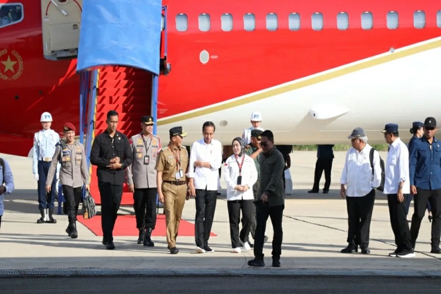 Presiden Republik Joko Widodo tiba di Bandara Tampa Padang Mamuju, sekitar pukul 15.55 Wita, setelah menempuh penerbangan selama lima jam 40 menit dari Pangkalan TNI AU Halim Perdanakusuma Jakarta, Senin (22/4/2024)