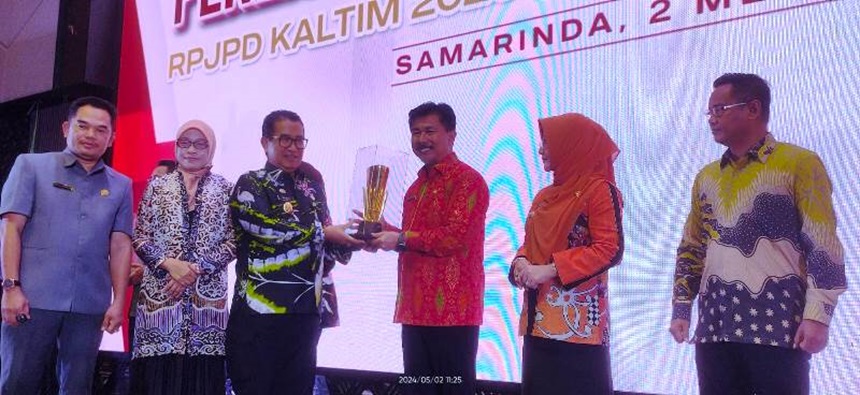 Penghargaan diserahkan oleh Penjabat (Pj) Gubernur Kaltim, Prof Akmal Malik kepada Sekretaris Daerah (Sekda) Dr Sunggono pada acara Musrenbang RPJPD Kaltim 2025-2045 dan RKPD Kaltim 2025 di Hotel Mercure Samarinda, Kamis (2/5/2024).