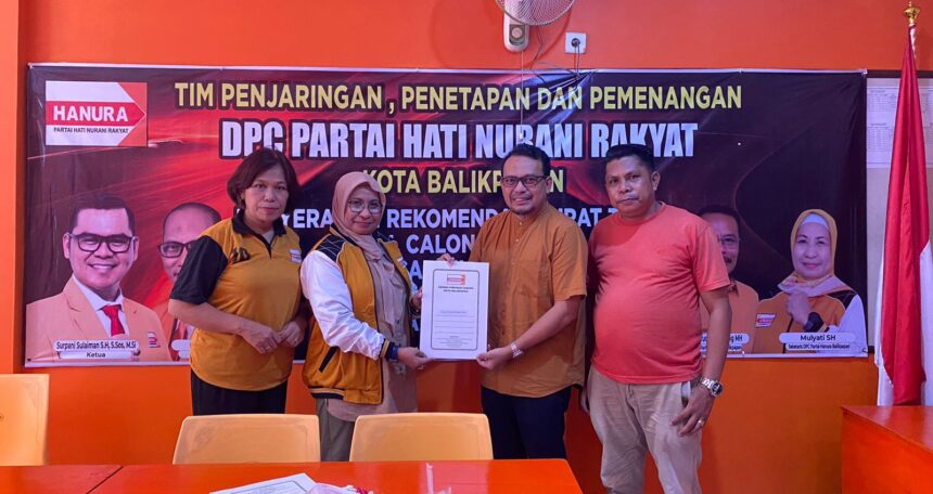 BERITAKALTIM.CO – DPC Partai Hati Nurani Rakyat (Hanura) Kota Balikpapan melalui Tim Penjaringan, Penetapan dan Pemenangan (TP3) menyerahkan rekomendasi surat tugas bakal calon (Bacalon) Wali Kota dan Wakil Wali Kota Balikpapan periode 2024-2029.