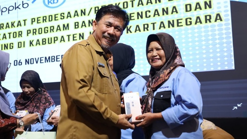 Penyerahan smartphone pada kegiatan revitalisasi institusi masyarakat perdesaan/perkotaan (IMP) dalam meningkatkan capaian indikator Program Bangga Kencana (Pembangunan Keluarga, Kependudukan, dan Keluarga Berencana) dan percepatan penurunan stunting di Kukar, Selasa (5/11/2024) di Ballroom Hotel Harris Samarinda.