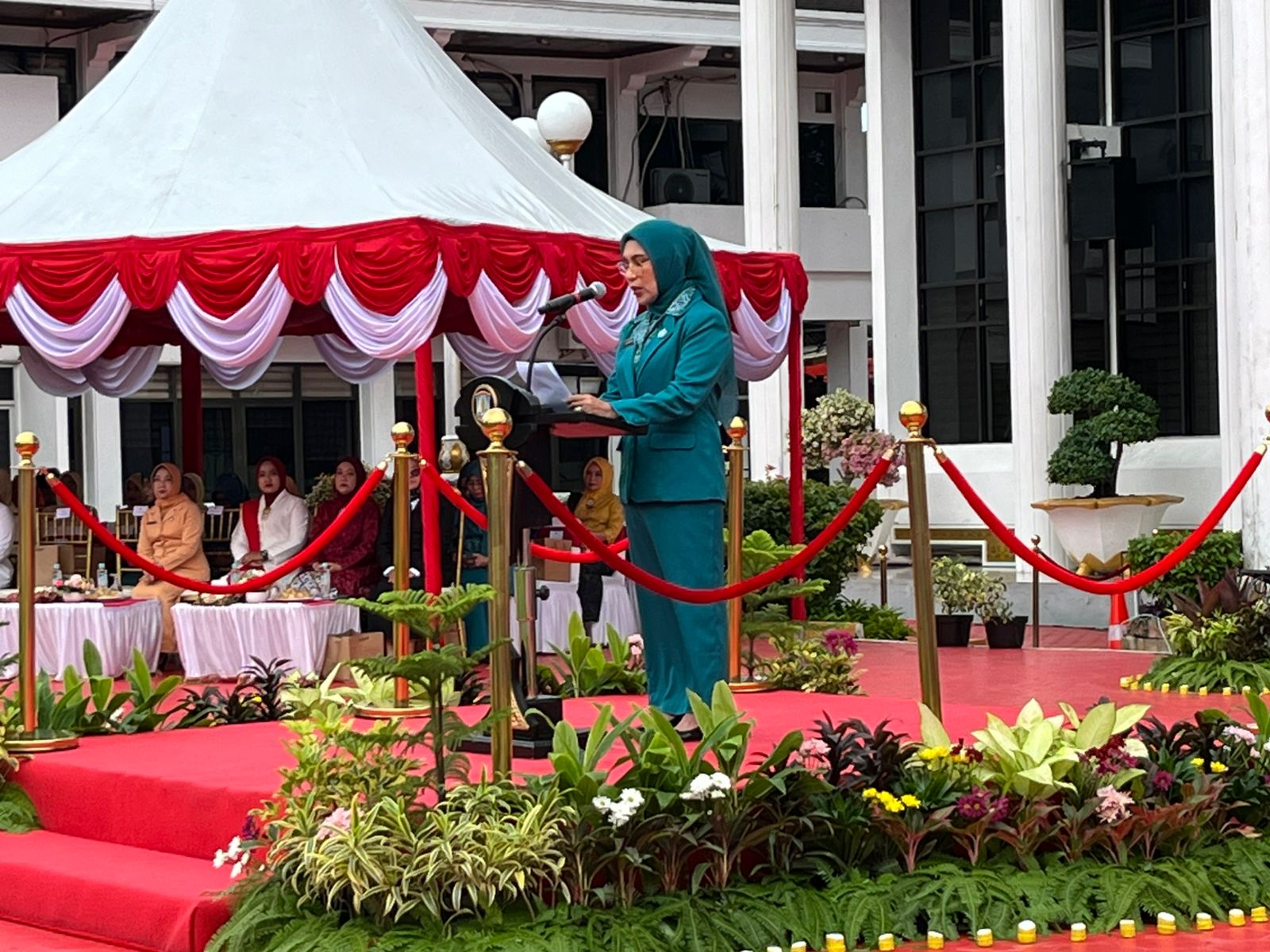 Saat memimpin upacara, di Halaman Balai Kota Balikpapan pada hari Minggu, 22 Desember 2024, Ketua TP-PKK Balikpapan membacakan sambutan Menteri Pemberdayaan Perempuan dan Perlindungan Anak Republik Indonesia, Arifatul Choiri Fauzi.