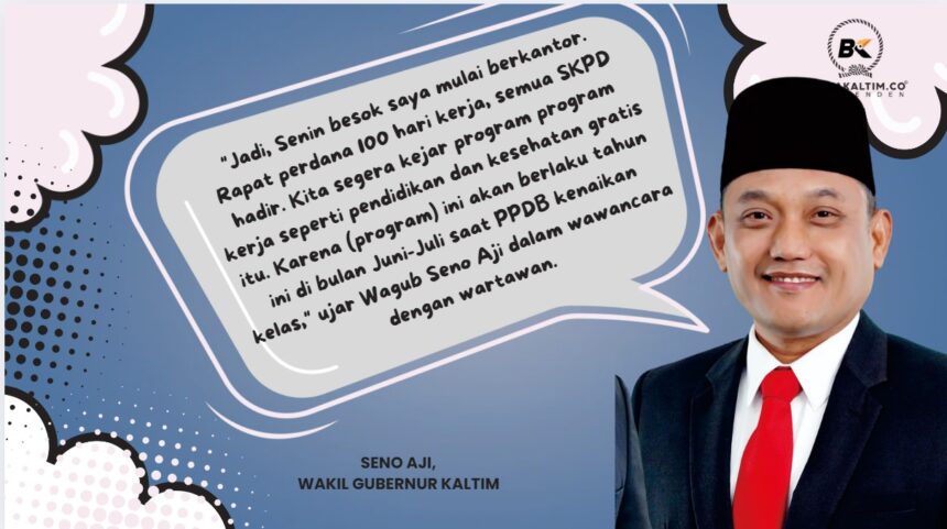 “Jadi, Senin besok saya mulai berkantor. Rapat perdana 100 hari kerja, semua SKPD hadir. Kita segera kejar program program kerja seperti pendidikan dan kesehatan gratis itu. Karena (program) ini akan berlaku tahun ini di bulan Juni-Juli saat PPDB kenaikan kelas,” ujar Wagub Seno Aji dalam wawancara dengan wartawan.