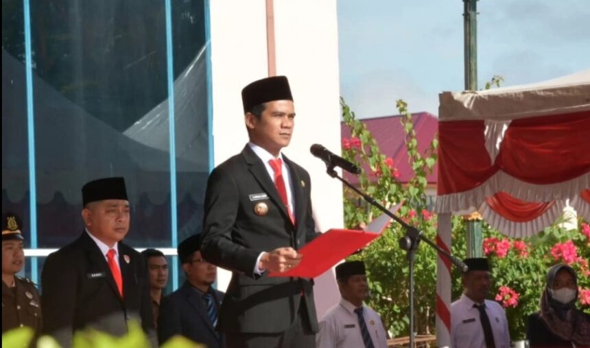 Bupati Nunukan H. Irwan Sabri selaku inspektur upacara, membacakan secara langsung sambutan Menteri Pendidikan Dasar dan Menengah Republik Indonesa, Abdul Mu’ti.