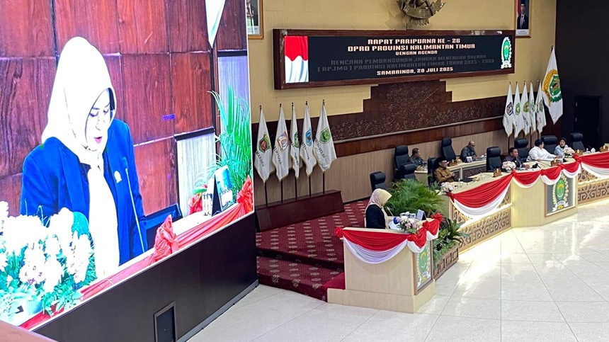 BERITAKALTIM.CO – Ketua Panitia Khusus (Pansus) RPJMD Provinsi Kalimantan Timur, Syarifatul Syadiah, menyampaikan laporan akhir hasil kerja pansus, terhadap Rancangan Peraturan Daerah tentang Rencana Pembangunan Jangka Menengah Daerah (RPJMD) Provinsi Kalimantan Timur Tahun 2025–2029 dalam rapat paripurna di gedung utama B DPRD Kaltim, Senin (28/7/2025).