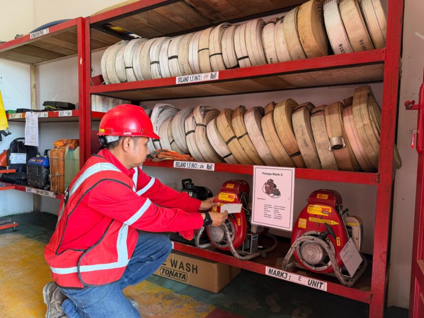 Untuk mendukung kesiapan operasional, perusahaan memastikan seluruh peralatan dalam kondisi optimal. Tim lapangan dilengkapi kendaraan patroli seperti sepeda motor, kendaraan operasional, mobil pemadam, hingga baby tank untuk suplai air.